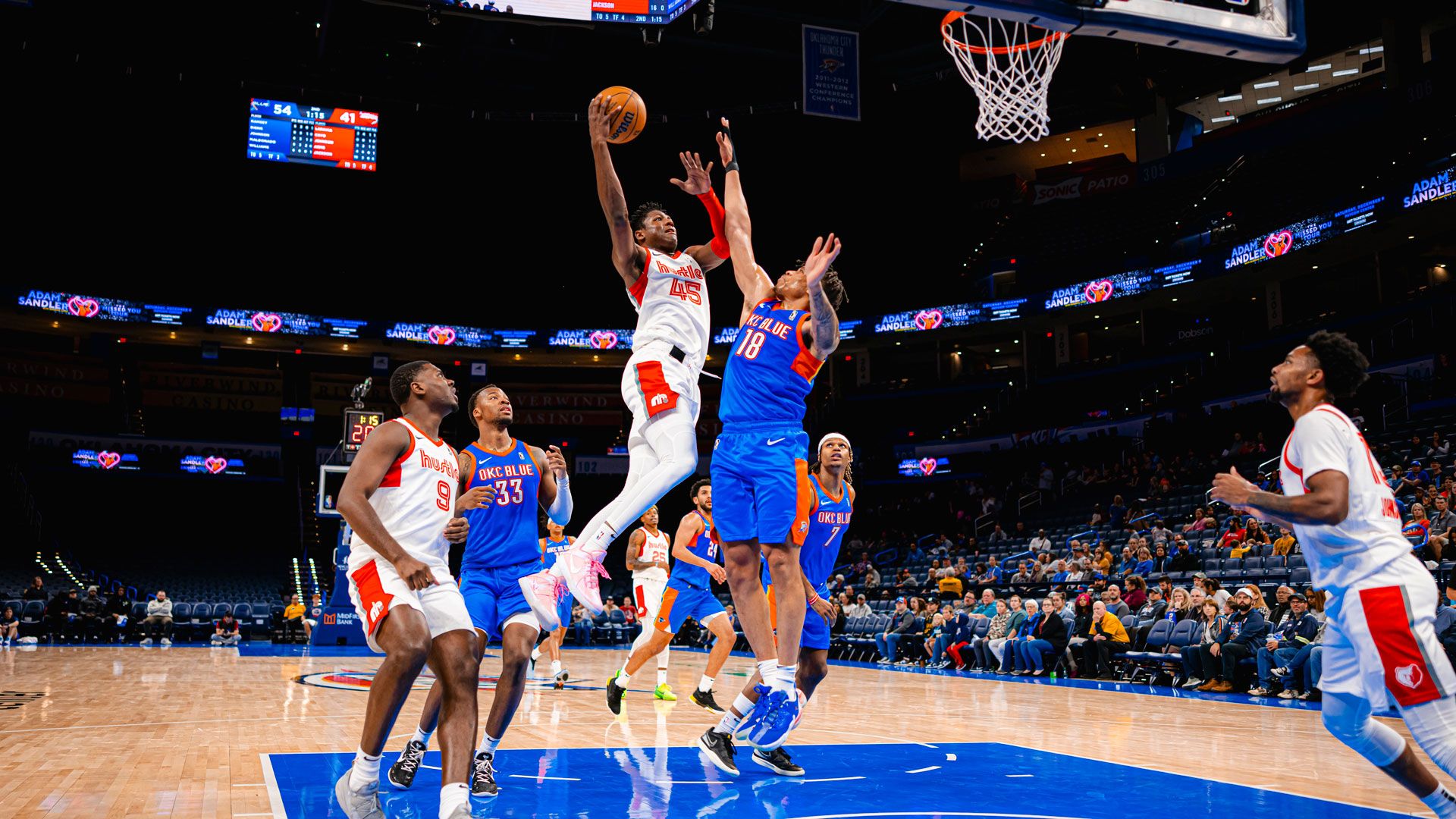 Oklahoma City started the game scoring the first seven points as part of a 21-11 run and pushed its lead to 18 in the third quarter. The Hustle cut the deficit to six midway through the fourth quarter, but the Blue closed the game on a 16-8 run to secure the victory.